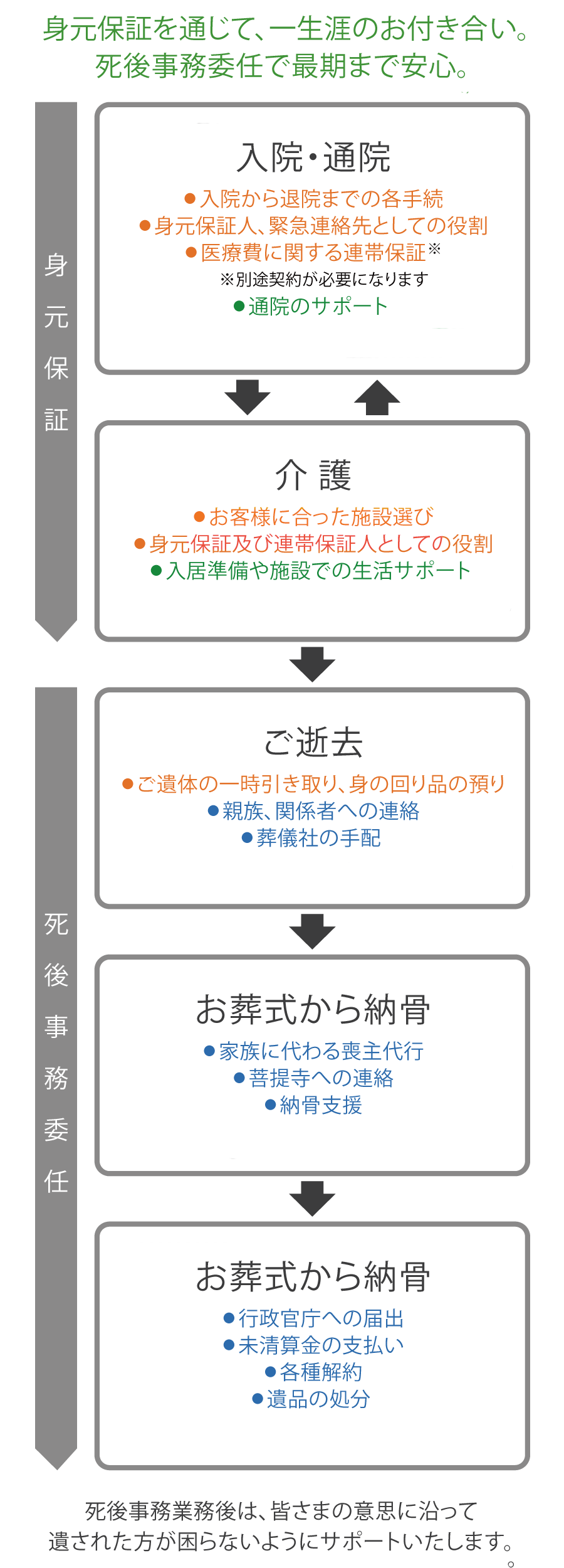一時的な検査入院や、退院の見込みのある入院をする方の「身元引受」「連帯保証」をお引受けいたします。